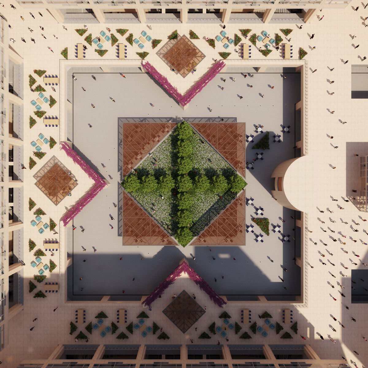 Design partner José Bruguera—a lead designer of the original complex, completed in 2002—has reimagined its central plaza as a vibrant, multilayered environment with abundant green space, including an orange grove and extensive plantings. The project restores the grand spatial quality of the original plaza and sustainably updates the design, amenities, and technology of both plaza and lobbies, while offering WTC occupants and guests a variety of open and sheltered spaces for collaboration, dining, and recreation. Completion is expected next year.